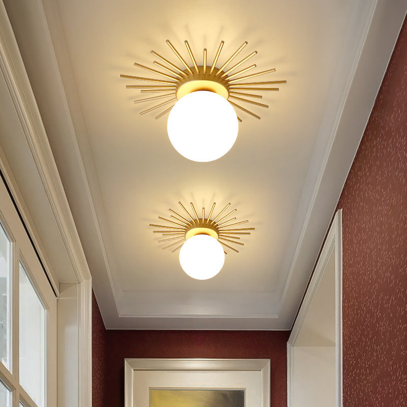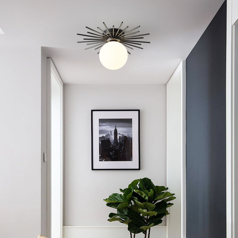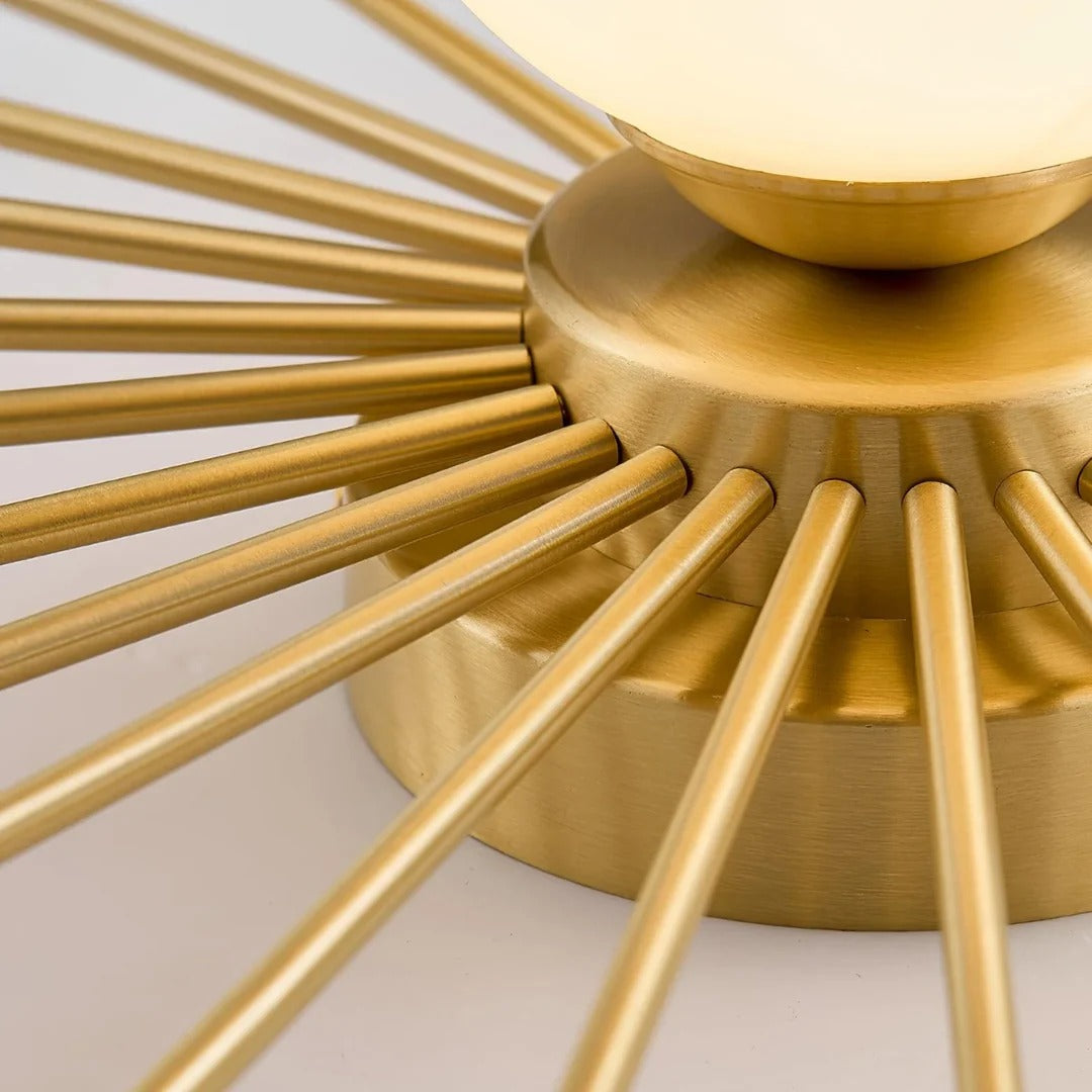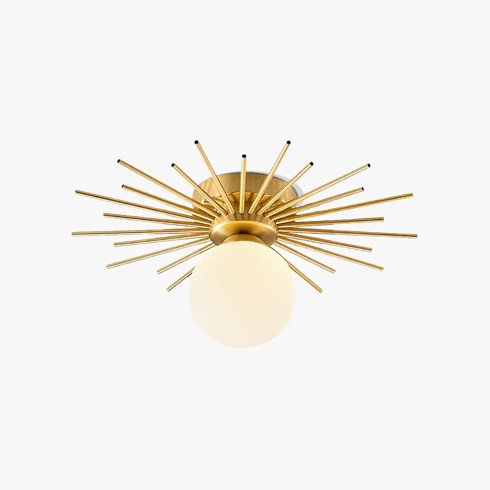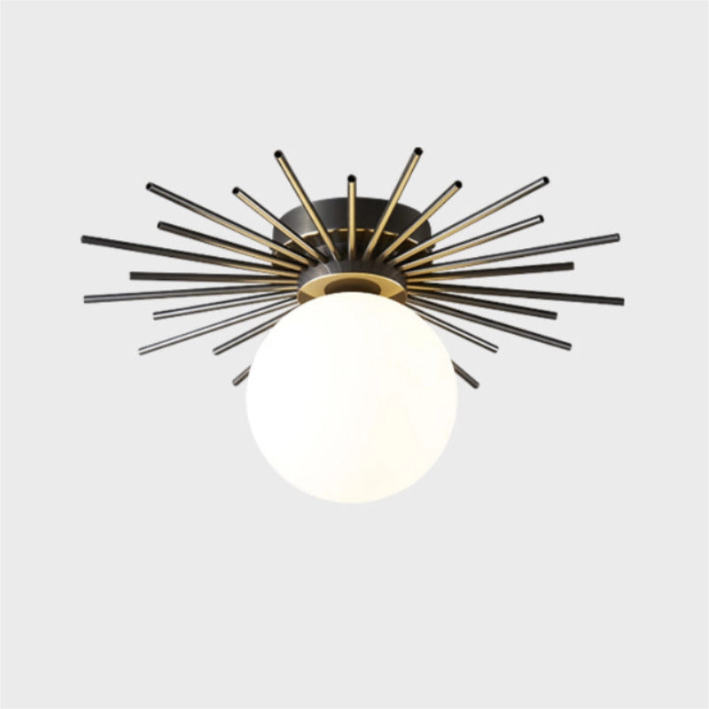 • For homeowners who appreciate modern design and practical illumination, this flush mount lighting fixture offers a warm, evenly diffused glow that sets a welcoming mood throughout any room. Its design features a circular main body with numerous radial arms extending outward to support a suspended spherical glass globe, blending sphere and rod elements in a way that fits seamlessly into living rooms, bedrooms, dining areas, and hallways. With a white dome-shaped shade supported by brass and black accents—crafted from durable brass and frosted glass and available in various color options—this fixture meets both style and function. It accommodates a single energy-efficient LED bulb to deliver steady light while its ceiling-mounted, direct wiring design ensures a secure and straightforward installation. Merging the classic appeal of mid-century modern aesthetics with subtle art deco accents, this lighting piece adds a refined touch to any interior setting without overwhelming your décor.