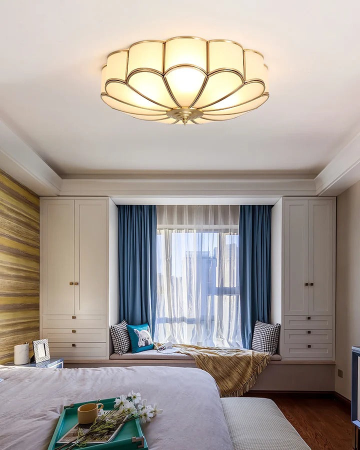 - For homeowners seeking a lighting update that balances everyday function with tasteful design, this flush mount ceiling light provides just the right mix of practicality and style. Its attractive floral design features smoothly curved, petal-like shapes arranged symmetrically around a central point, all highlighted by a crisp white dome-shaped shade and a sturdy brass supporting structure, with the entire fixture crafted from brass and frosted glass. Offered in a classic brass finish and available in three size variants for flexible configuration, it’s built to work seamlessly with LED bulbs to deliver energy-efficient illumination suitable for both ambient and task lighting. Ceiling-mounted and directly wired for a secure, permanent connection, this light fills living rooms, bedrooms, dining areas, studies, or even quiet hallways with an inviting radiance that eases the transition from lively activity to relaxed moments. Merging vintage allure with subtle art deco accents and a hint of contemporary ease, it creates an environment where decor and illumination effortlessly come together in harmonious style.