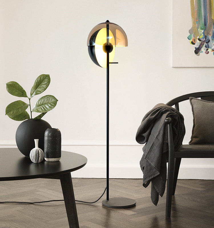 • Enhance your indoor spaces with a floor lamp that fits effortlessly into any room, whether you're setting the mood in a lively living room, adding a cozy glow for bedtime reading, providing focused light in your study, or simply accenting the décor in your dining area. The lamp’s warm, inviting illumination creates a refined atmosphere, perfectly suited for those cherished moments at home. With its distinctive hemispherical head and sturdy round base fixed on a straight vertical post, the lamp boasts a sleek black supporting structure paired with dome-shaped shades available in both black and amber, all crafted from quality metal and glass. Ideal for domestic consumers who appreciate both elegance and practicality, this lighting fixture combines form and function seamlessly; its energy-efficient LED bulbs offer long-lasting, dependable illumination while its plug-in design—with options for all regions—ensures a quick, hassle-free setup and flexible placement without any complex wiring. Bringing a touch of contemporary finesse to modern and mid-century modern interiors alike, this floor lamp adds a tasteful, contemporary aesthetic that transforms every indoor setting into a warm, inviting haven.