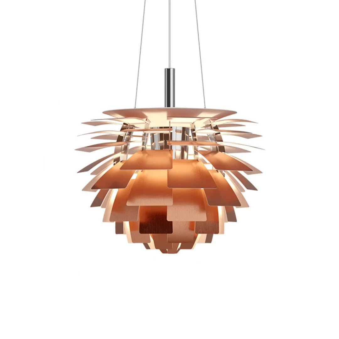 - The chandelier PRISMOFLARE showcases a layered spherical design with overlapping panels around a central rod, creating a cascading pine cone effect. Made from aluminum with a painted finish, it is available in white, silver, or orange. The chandelier comes in diameters ranging from 48 cm to 72 cm, offering versatile configurations to fit different spaces.